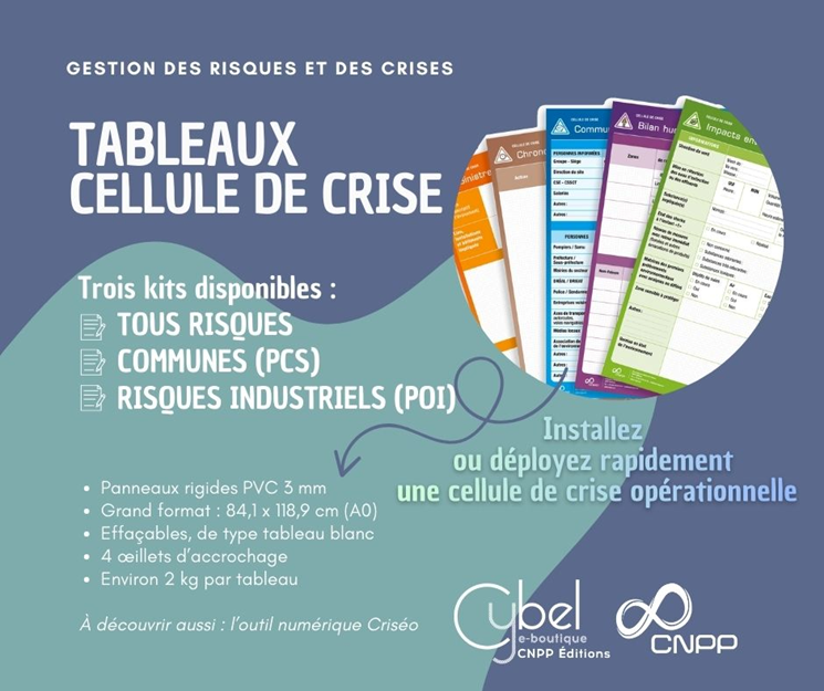 Ce kit de 7 tableaux au format A0 vous est proposé par nos experts en gestion des risques et des crises pour piloter efficacement une situation d’urgence, quelle qu’en soit la nature : aléa naturel, cyberattaque, accident industriel, crise réputationnelle, rupture de supply chain, etc. Polyvalent, il est conçu pour répondre aux besoins d’acteurs divers (entreprises, collectivités, associations, etc.) et complète les kits spécialisés Risques industriels (POI) et Communes (PCS).